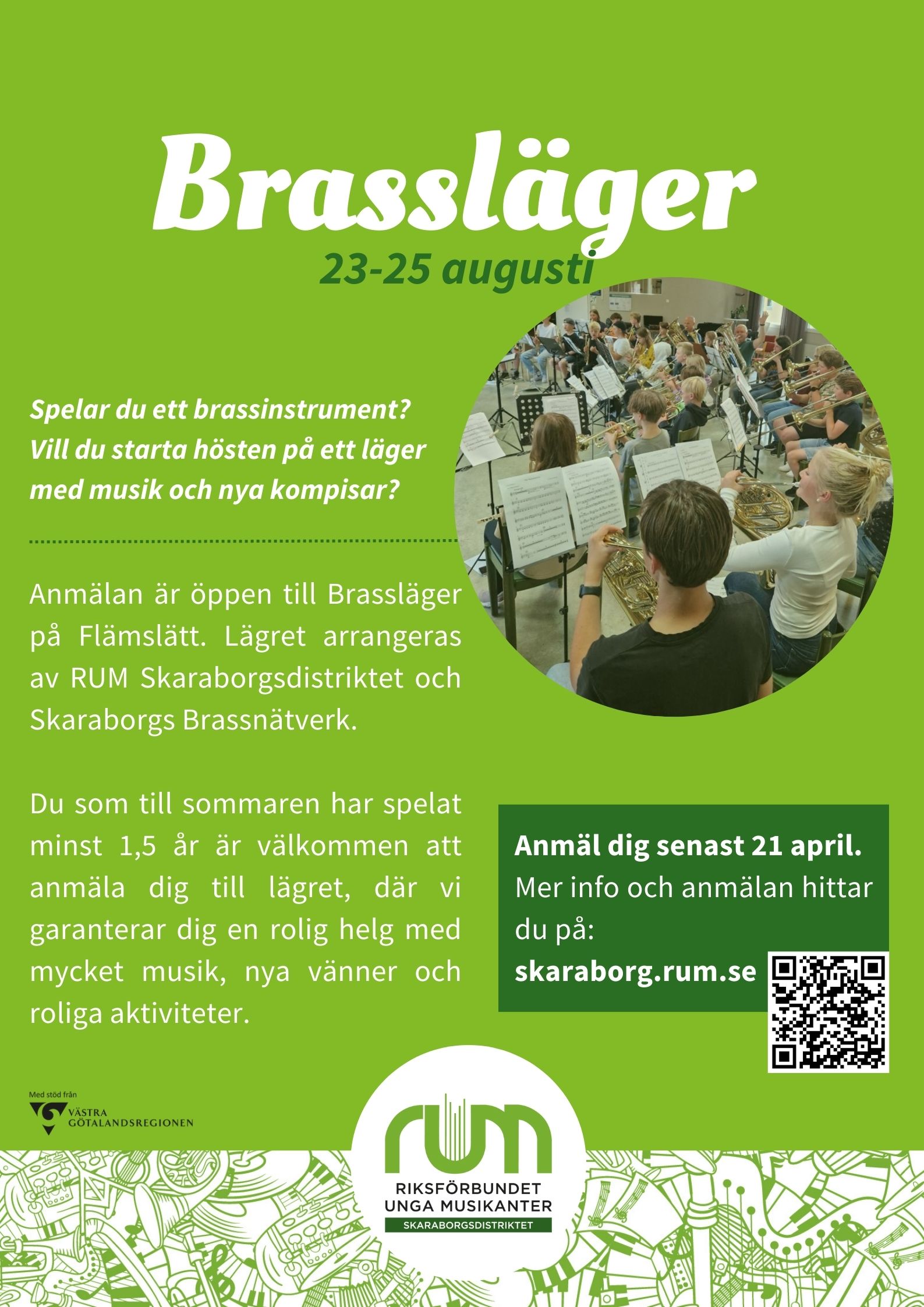 RUM Skaraborg i samarbete med Skaraborgs Brassnätverk är glada att åter igen bjuda in dig till Brassläger på Flämslätt Stifts- och Kursgård utanför Skara. Du som till sommaren har spelat minst 1,5 år, är RUM-medlem och bosatt i Skaraborg, är välkommen att anmäla dig till lägret, där vi garanterar dig en rolig helg med mycket musik, nya vänner och roliga aktiviteter!